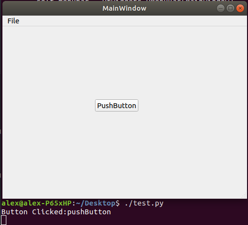 Here we defined a class MyMainWindow which inheriting from QMainWindow and Ui_MainWindow, then we defined __init__ method which will setupUi and binding button clicked event with onBtnClicked. When pushButton was clicked, we can see output in terminal: