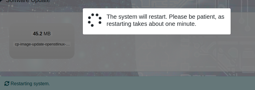 We defined postupdatecmd = "reboot"; in swupdate.cfg, so system will automatically reboot: